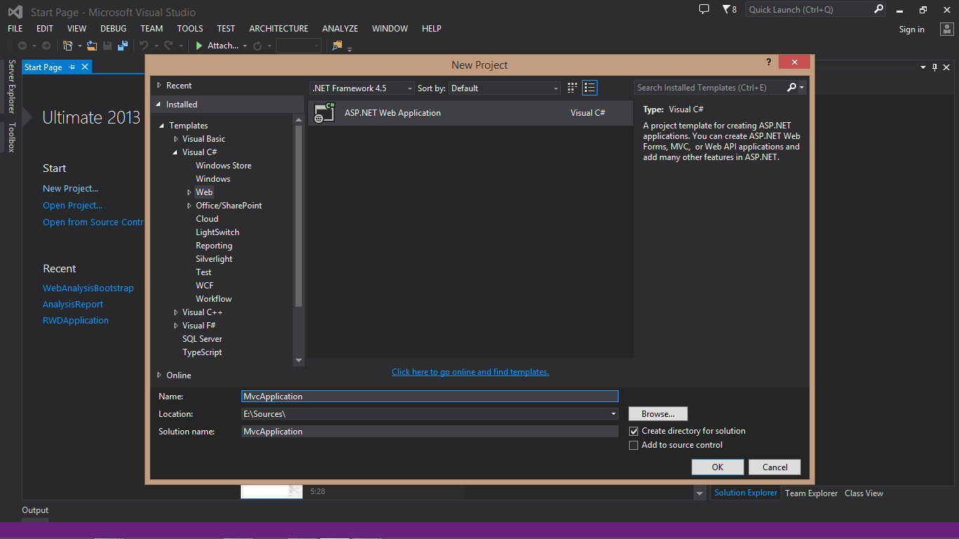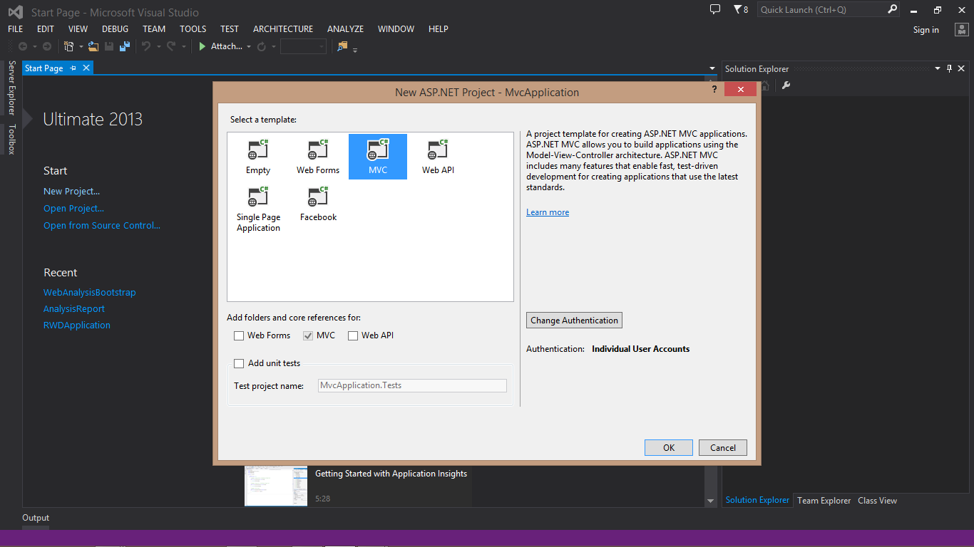 Select MVC template from the template options, make sure MVC option is selected in check box