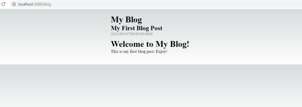 Visit http://localhost:3000/blog in your browser, and you should see your blog with the first post displayed.